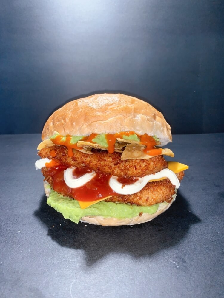 Chicken Schnitzel, Tomato Salsa, Avocado, American Cheese, Sour Cream, Corn Chips with Hot Chilli Sauce