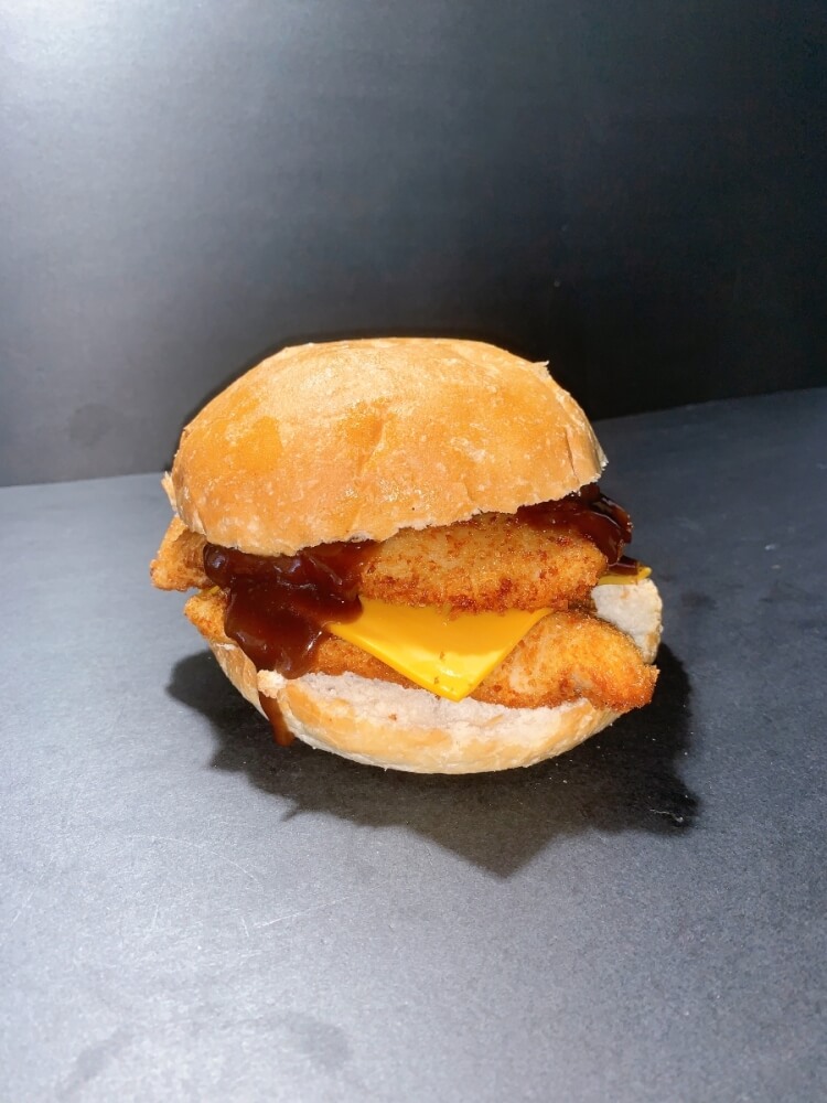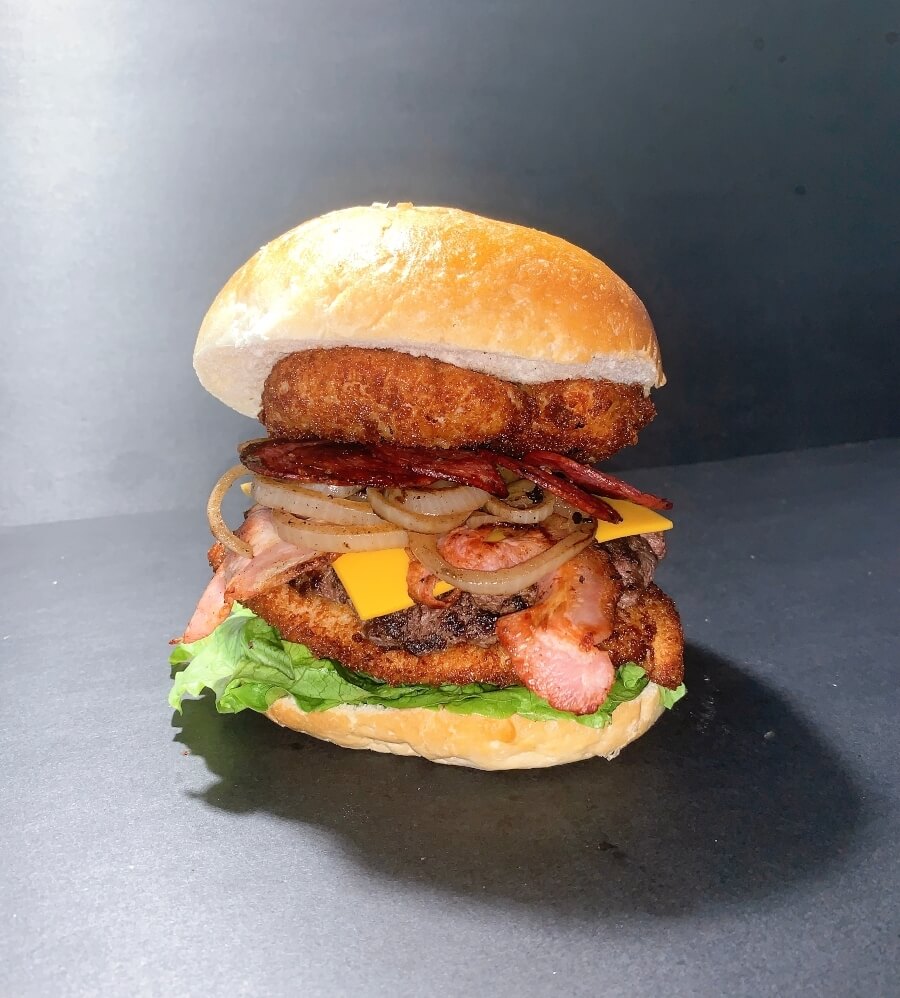 Chicken Schnitzel + Aussie Beef Patty, Bacon, American Cheese, Pepperoni, Onion, Lettuce, BBQ Sauce