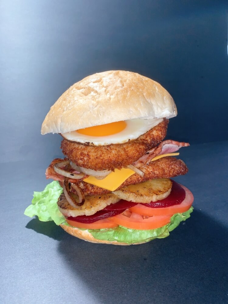 Chicken Schnitzel, American Cheese, Lettuce, Tomato, Onion, Beetroot, Pineapple, Fried Egg, Bacon