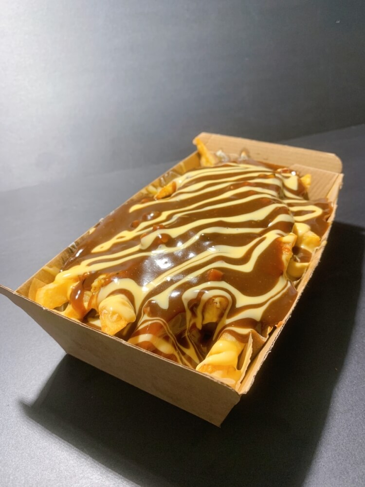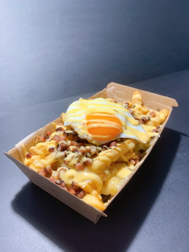 Fries, Fried Egg, Bacon, Hash Brown, Cheese, Cheese Sauce + BBQ Sauce