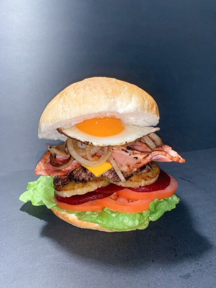 Aussie Beef, American Cheese, Lettuce, Tomato, Onion, Beetroot, Pineapple, Fried Egg, Bacon