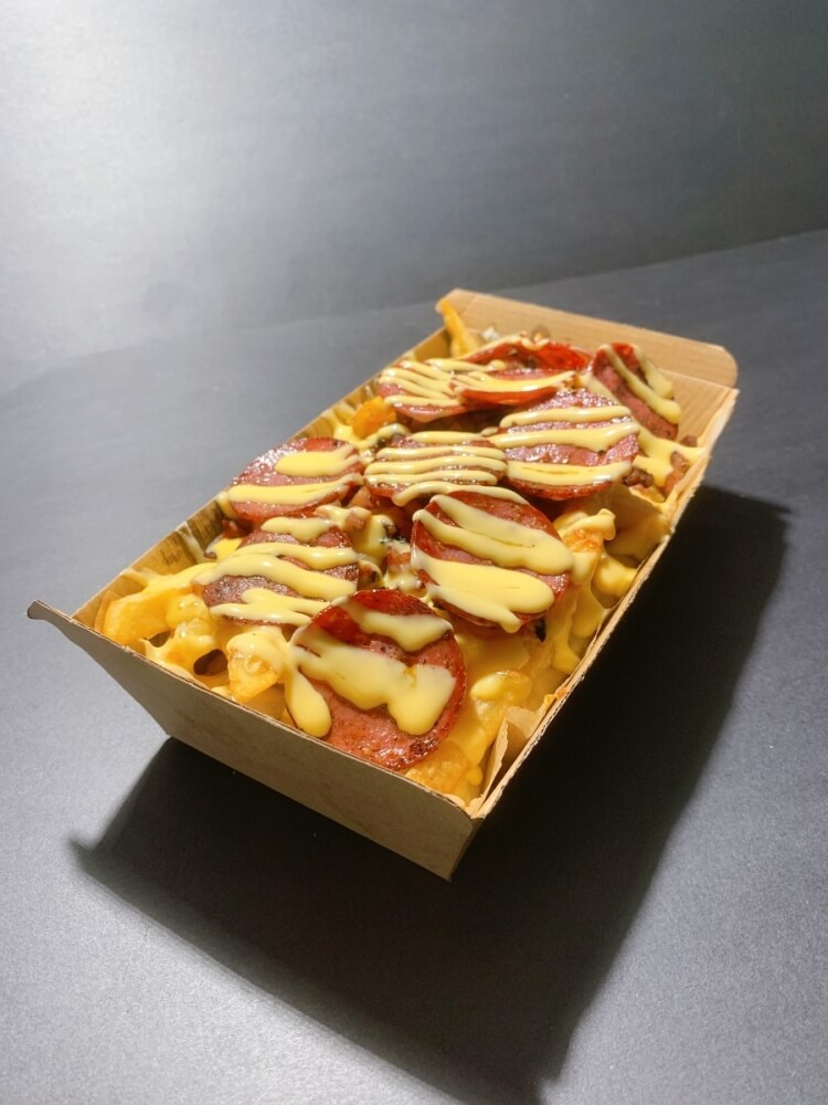 Fries, Shredded Cheese, Thinly Sliced Pepperoni, Diced Bacon, Cheese Sauce